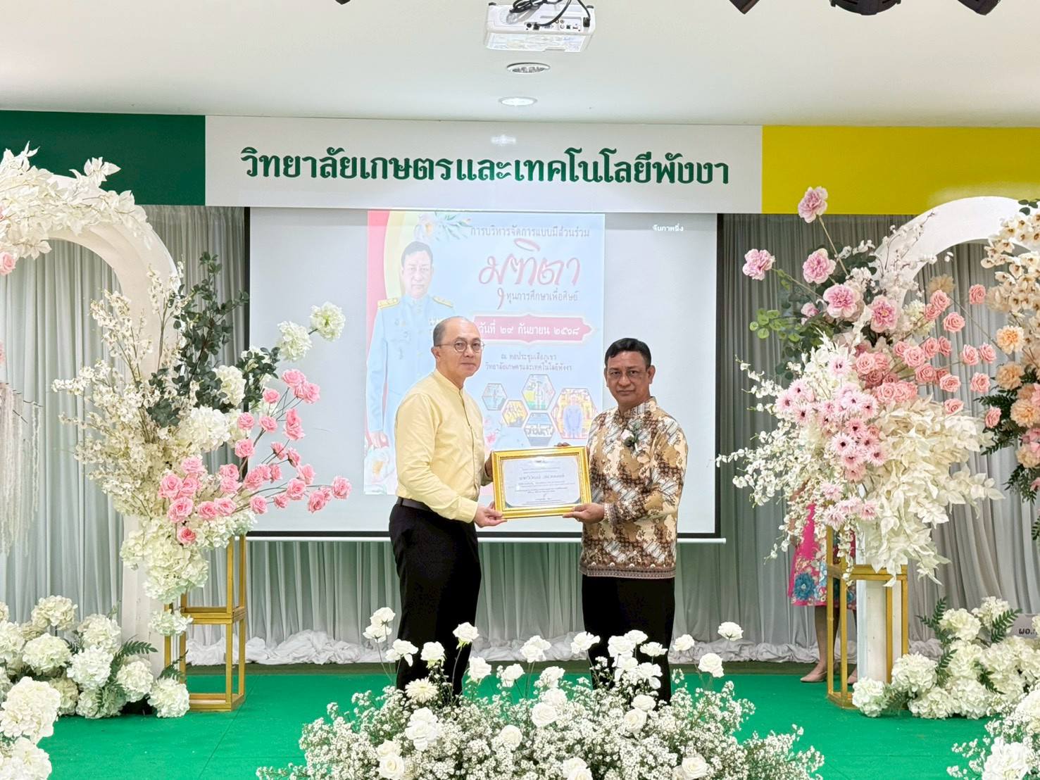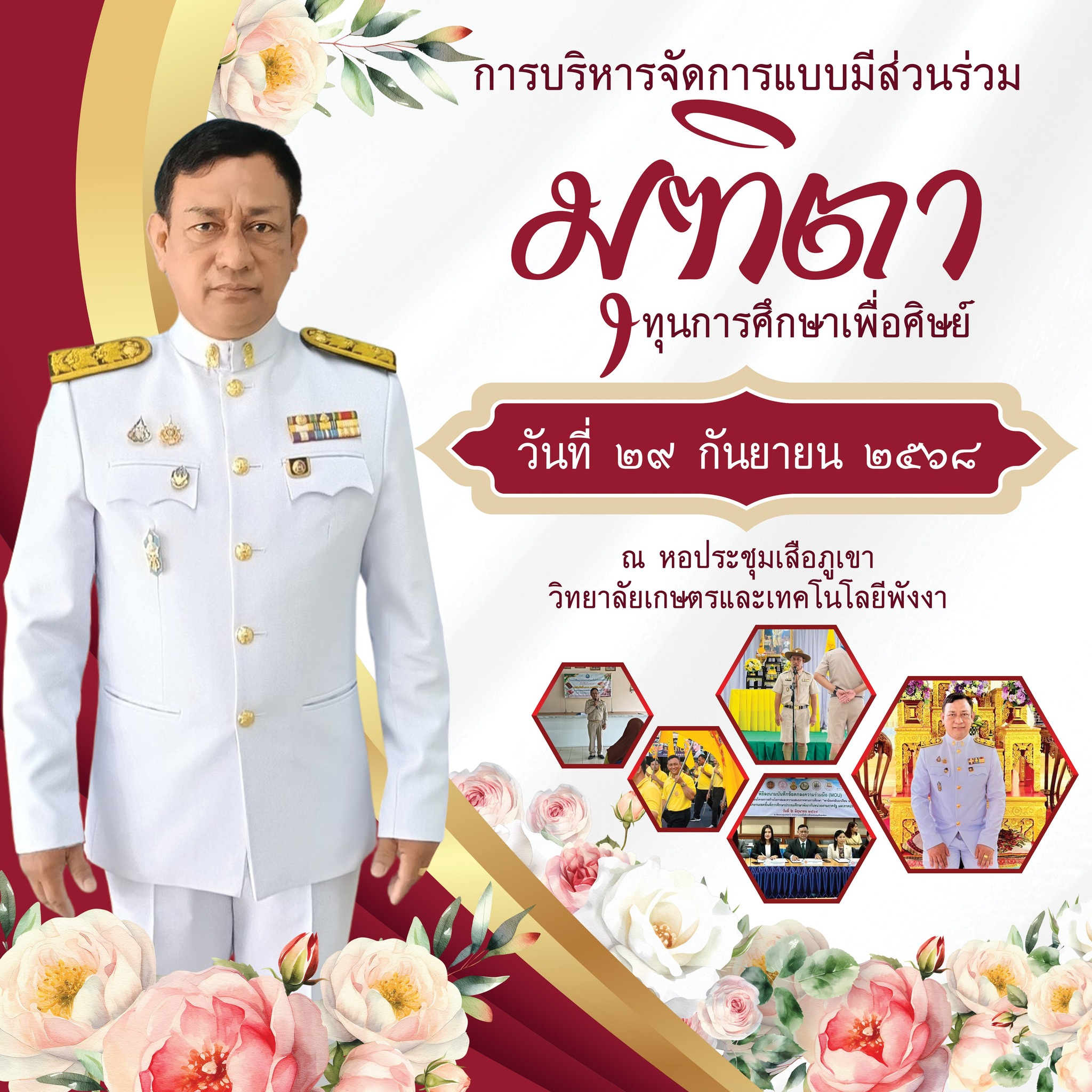 วิทยาลัยเกษตรและเทคโนโลยีพังงา ได้จัดพิธีแสดงมุทิตาจิตแด่ นายสุพรชัย อัมภา ผู้อำนวยการวิทยาลัยเกษตรและเทคโนโลยีพังงา เนื่องในโอกาสเกษียณอายุราชการ ประจำปี พ.ศ. 2568 โดยมีคณะผู้บริหาร ครู บุคลากรทางการศึกษา ศิษย์เก่า ศิษย์ปัจจุบัน และแขกผู้มีเกียรติ เข้าร่วมงานอย่างอบอุ่น