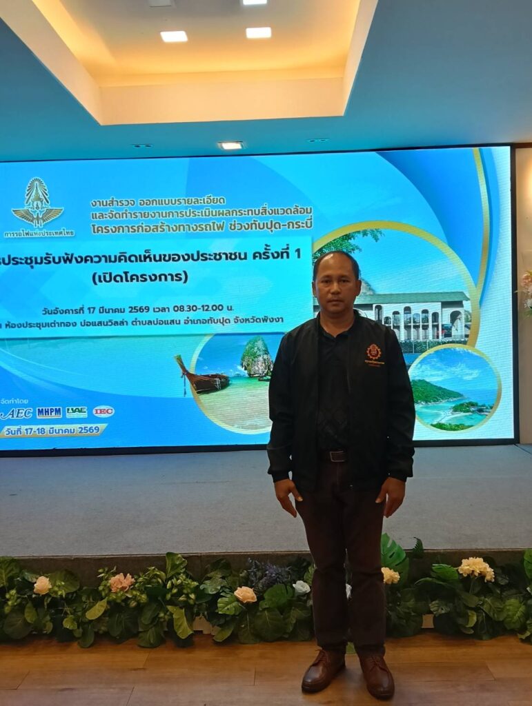 วันอังคารที่ 17 มีนาคม 2569 นางสาวพิชญานิน รองเมือง ผู้อำนวยการวิทยาลัยเกษตรและเทคโนโลยีพังงา มอบหมายให้นายภาณุพันธ์ อยู่มะนะ หัวหน้าแผนกวิชาช่างกลเกษตร เข้าร่วมการประชุมรับฟังความคิดเห็นของประชาชน ครั้งที่ 1 โครงการก่อสร้างทางรถไฟช่วงทับปุด–กระบี่ ณ ห้องประชุมเต่าทอง โรงแรมบ่อแสนวิลล่า ตำบลบ่อแสน อำเภอทับปุด จังหวัดพังงา